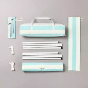 Disfrute de un día soleado al aire libre con el Parasol de Rayas Brillantes de Hearth & Hand™ con Magnolia. Con un patrón de rayas en tonos verde claro, crema y azul, este parasol tiene un borde festoneado y es un práctico complemento para su espacio exterior. Este parasol de tela incluye un poste de acero y una estaca para facilitar su instalación y ofrece protección solar adicional gracias a su diseño con FPS 50+.