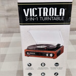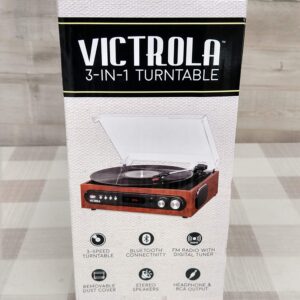 El tocadiscos todo en uno Victrola con cubierta de polvo acrílico extraíble es perfecto para los amantes del vinilo con su plato giratorio de 3 velocidades. Transmite tu música a través de Bluetooth. Reproduce tus canciones favoritas en la radio FM.