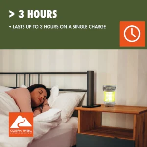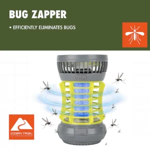 Este Ozark Trail Bug Zapper con ventilador 2in1 y linterna led es eficaz contra pequeños insectos voladores, atrayéndolos con tecnología UV eliminándolos en el acto. 5V de potencia activa la luz led y el ventilador: longitud del haz de luz 5M, ángulo de cobertura de 360 grados. Cargue las baterías recargables de litio con un cable USB y la unidad está lista para matar los errores. El Bug Zapper es pequeño, ligero y fácil de llevar, viene con percha. Seguro de usar en interiores o exteriores. Limpie los desechos lejos de la bobina electrónica con un pequeño cepillo suave, listo para usar nuevamente.