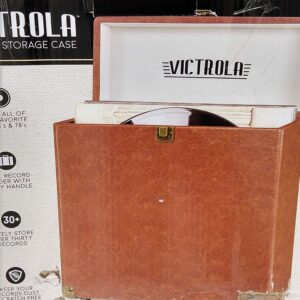 Estuche de almacenamiento Victrola para discos de giradiscos de vinilo.Almacene sus discos de vinilo con estilo con el estuche para discos de vinilo Victrola. Este estuche almacena de forma segura más de 30 de sus 33, 45 y 78 favoritos. Mantiene sus registros de polvo y arañazos y totalmente protegido con hardware resistente, protectores de esquina y bisagras.